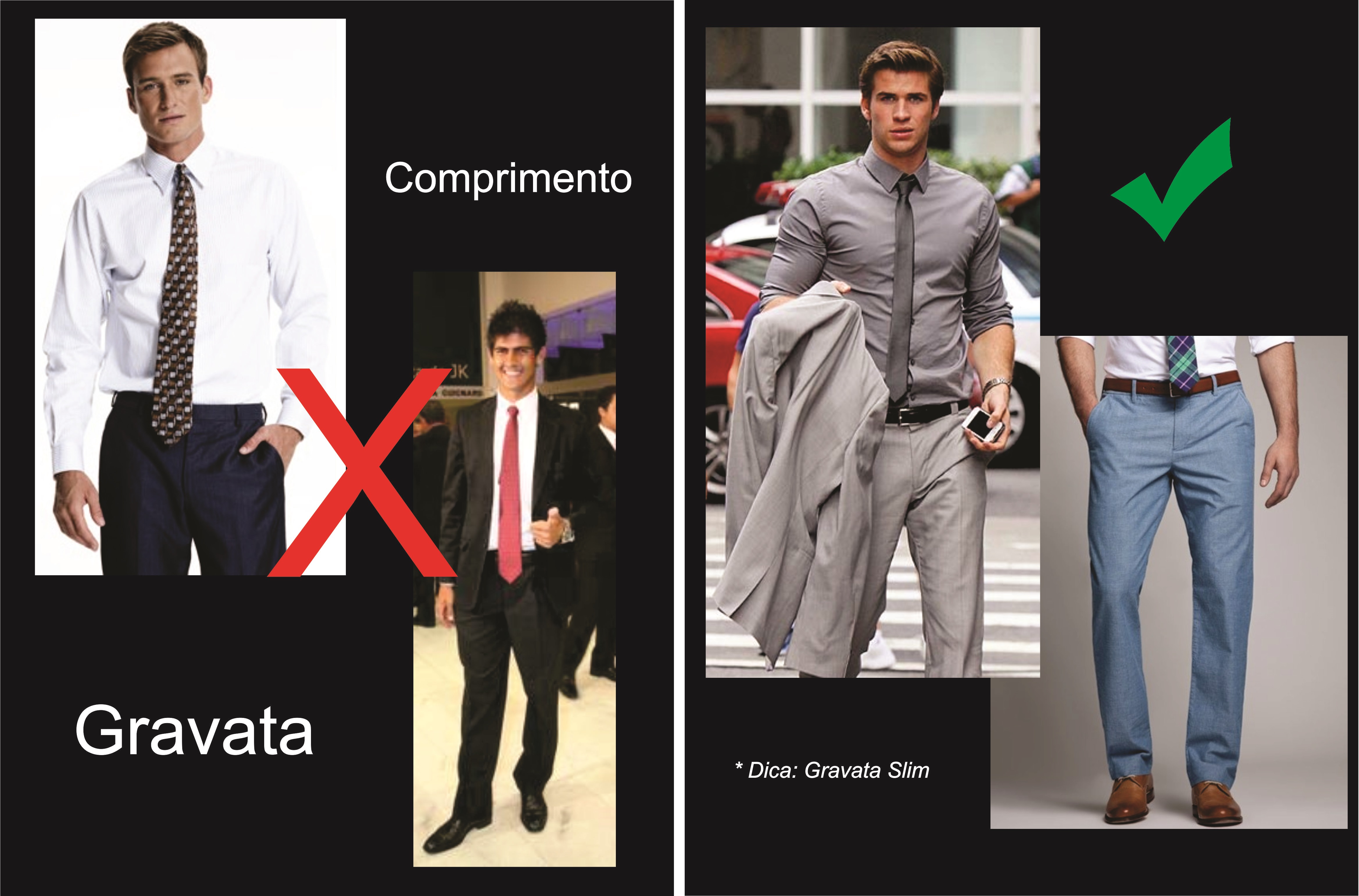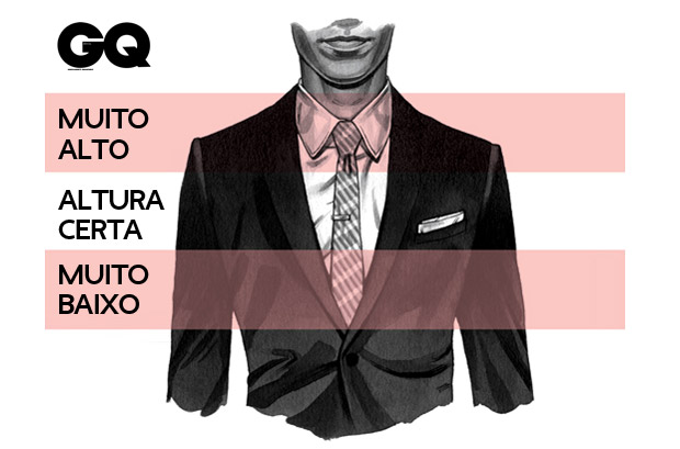 - O tamanho certo da gravata é aquele que toca ou no máximo cobre a fivela do seu cinto quando está de pé por isso, coloque a gravata somente depois de já ter vestido e ajustado todas as demais peças, incluindo as que são essenciais para a própria colocação da gravata. Gravata abaixo ou acima do cinto vai chamar a atenção de forma negativa.