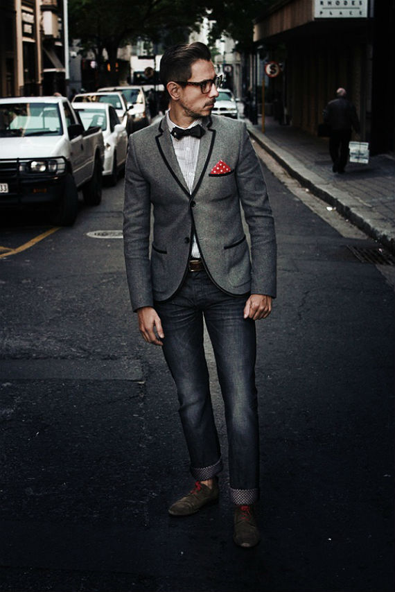 - Gravata com jeans exige algumas condições: Com camisa e sapato sociais e calça impecável, sem detalhes ou rasgos e sempre uma lavagem mais discreta. Deve usar blazer mais acinturado para compor um look mais moderno. Não dá pra tirar o blazer, ele é que dá o charme do visual. Só de calça e camisa a gravata fica deselegante. Essa combinação é ideal para jantares com amigos, reunião casual ou eventos em que o terno não é imprescindível.