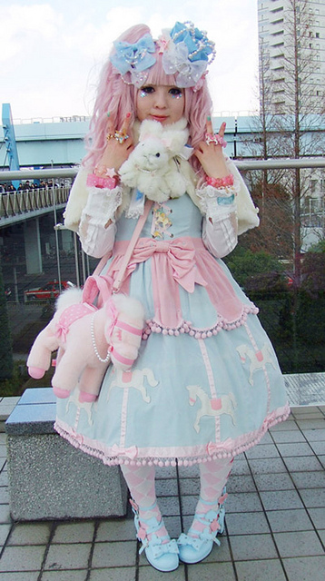O termo ficou designado para as jovens com apelo sexual, assim como no livro chamado “Lolita” que até ganhou uma minissérie brasileira. Só que a moda Lolita não tem NADA disso! Lolita é um estilo de moda alternativa de rua no Japão cujas primeiras manifestações apareceram em fins da década de 70 e começo da década de 80. Isso mesmo! Nas ruas do Japão podemos nos deparar com diversas dessas garotas, usando seus vestidos lindos, seus sapatos de criança e seus laços gigantescos! Muitos dizem são meninas que se vestem de bonecas mas não são, na verdade a intenção é parecer infantil, elegante ou modesta, evitando uma imagem adulta, sexualizada (independente do sub-estilo) ou vulgar. Embora tenham Lolitas no Brasil, elas nem se comparam com as japonesas justamente porque no Brasil as meninas querem parecer bonecas e no Japão elas querem parecer inocentes! Suas roupas são inspiradas no Rococó e na era Vitoriana e Edwardiana. Saias rodadas no comprimento do joelho, em forma de sino e suportadas por anáguas,renda de boa qualidade (geralmente algodão), decote alto, cabelos cacheados e/ou acompanhados a uma franja reta e tecidos pouco brilhantes são comuns a todos os estilos. Entre os tecidos mais usados, o que predomina é o algodão. Tricoline e até chiffon podem ser usados, além de outros tecidos de fibras naturais e de boa qualidade. Tecidos brilhantes como cetim são sempre evitados, pois podem dar uma aparência barata ou vulgar a uma peça Lolita. Esta é outra diferenças entre as Lolitas brasileiras e japonesas pois embora se vistam assim, as brasileiras encurtam um pouco as saias e usam muito cetim. Existe mais ou menos 13 estilos de Lolitas e no Brasil a maioria das meninas usam apenas o Deco Lolita, uma mistura do estilo Decora com o Lolita. Usa-se muitos acessórios variados e coloridos como prendedores de cabelo, laços enormes na cabeça, perucas e estampas coloridas. As cores são geralmente em tons pastel, e cores cítricas, fluorescente ou muito chamativas são usadas com extrema moderação ou evitadas.