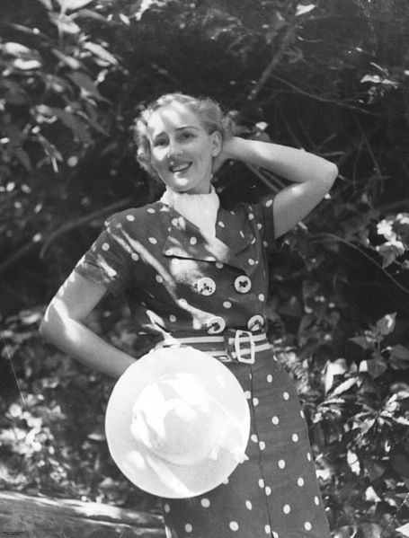 Woman_posing_in_a_1930’s_polka-dot_dress Modelo posando para revista de moda dos anos 30. Woman_posing_in_a_1930’s_polka-dot_dress