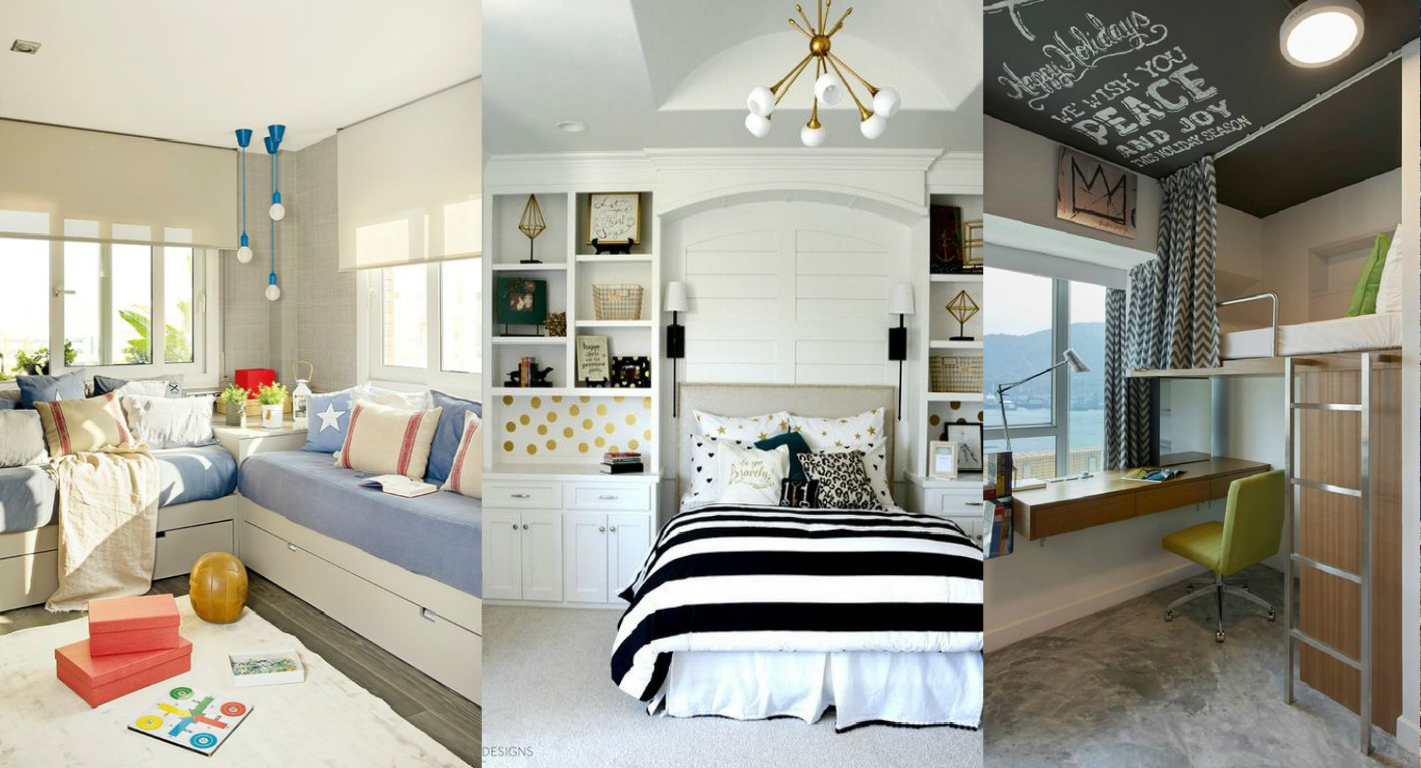 • Se o quarto for para duas crianças ou adolescentes e colocar uma cama do lado da outra e mais um guarda-roupa deixar o comodo muito apertado, uma dica é colocar as camas em “L” para sobrar espaço no meio. As camas podem ser mais altas e utilizar a parte debaixo para camas extras, gaveteiros.
