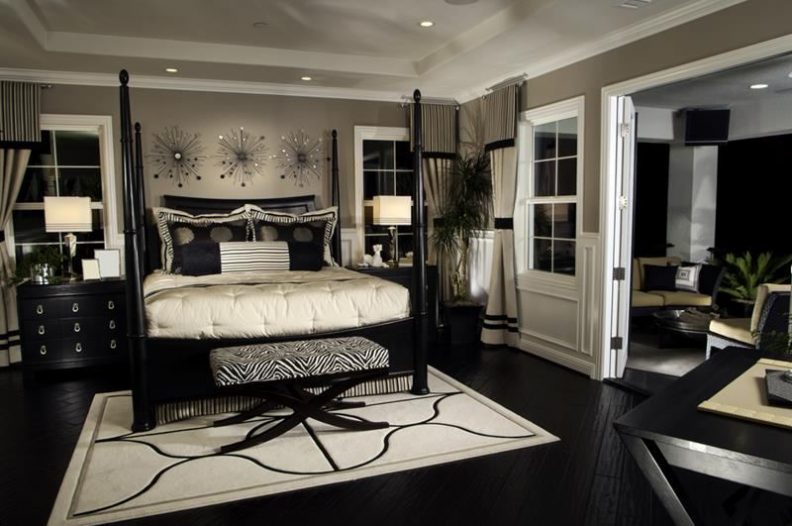dark-bedroom-furniture-and-light-walls-brown-pillow-purple-covered-bedding-wall-mount-table-rustic-wooden-floor-bedside-dark-brown-table-792×526