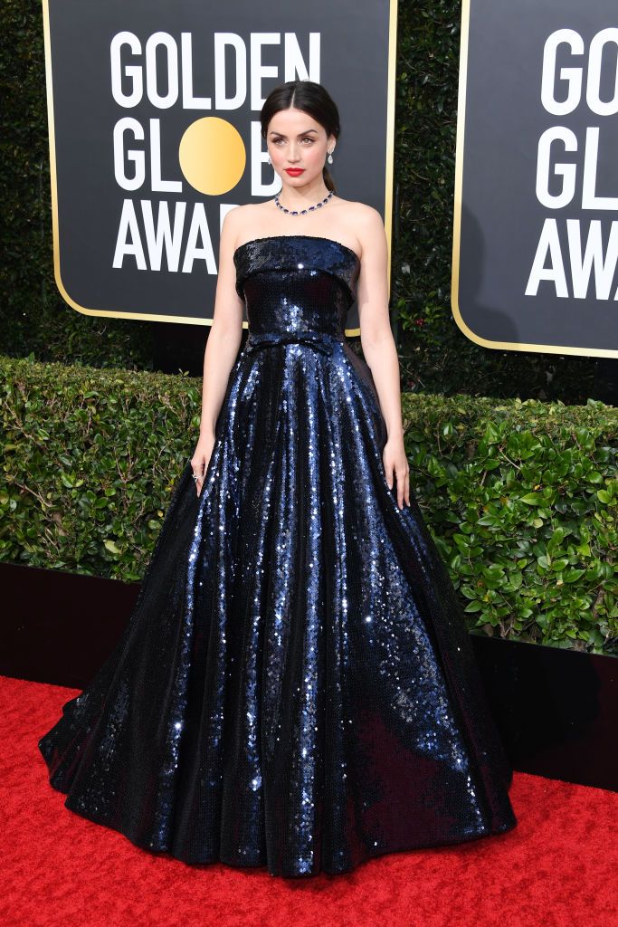 Depois vem o look de Ana de Armas, estrela do filme Knives Out – Entre Facas e Segredos, eleito o “Melhor Look Simples” pois embora o modelo seja simples, o toque especial ficou por conta da cor e do brilho e também na combinação de cabelo, maquiagem e acessórios, que criou uma aparência requintada. Esse look realmente eu gostei muito pois é harmonioso, chique na medida certa!