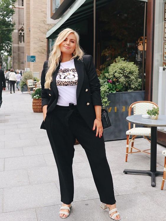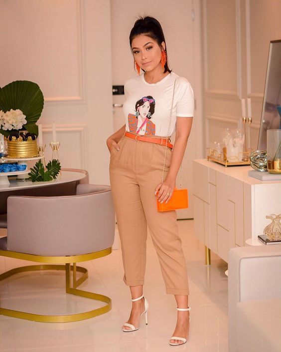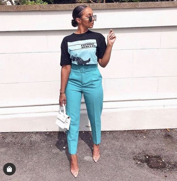 - Com calça social: elas dão um ar mais elegante ao look do que o jeans mas também podem ser usadas com vários estilos de sapato, basta decidir qual a linha queira seguir. Podem ser de couro, justas, pantalona, podem combinar com a cor da camiseta ou com uma das cores da estampa, pode ser de cor diferente o que você preferir ou tiver no guarda-roupa, o importante é não abusar dos acessórios pois se for na medida certa você vai arrasar com certeza.