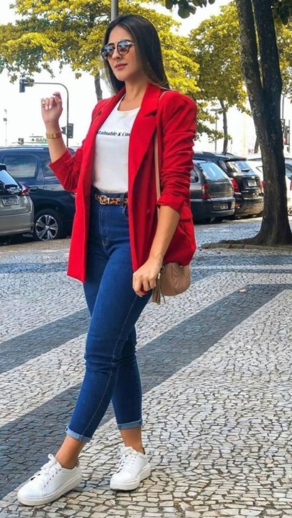 - Com calça jeans e blazer: o jeans pode ser de qualquer modelo mas evite calças rasgadas, as famosas Destroyed. Se gostar, abuse dos blazers, principalmente nas cores que estão em alta como rosa, fúcsia, verde, azul e roxo, se você gostar dessa cores, se não, use cores neutras mesmo como branco, bege, marrom, preto e cinza. Os sapatos podem ser de salto alto, baixo ou até mesmo tênis. Veja alguns exemplos abaixo: