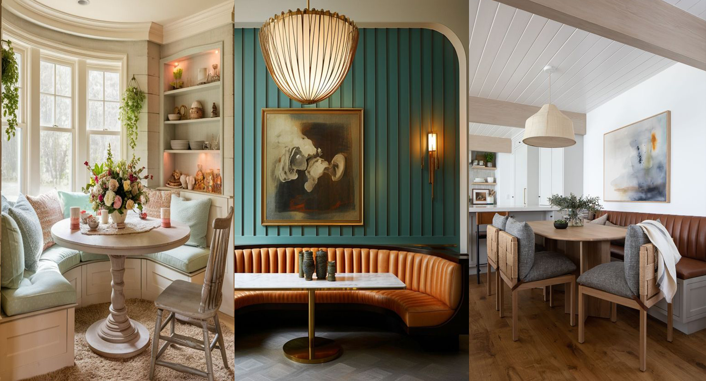 Após a Primeira Guerra Mundial os Estados Unidos também sofreu com a crise economica nos anos posteriores, e foi a partir daí que os Bangalôs americanos, ou casas compactas, viraram febre e as plantas já vinham com um pequeno ângulo reservado para o banco de canto ou “Nook” – “Recanto”, também pode ser chamado de “Breakfast Nook” – “Recanto do Cafè da Manhã” ou ainda “Dining Nook” – “Recanto de Jantar”. Assim como na Europa, o “Nook” pode ter formato em L ou U ou ser um banco reto ou sofà. Assim como na Alemanha, nos Estados Unidos também se encontra em sites de lojas de moveis, como nos exemplos abaixo.