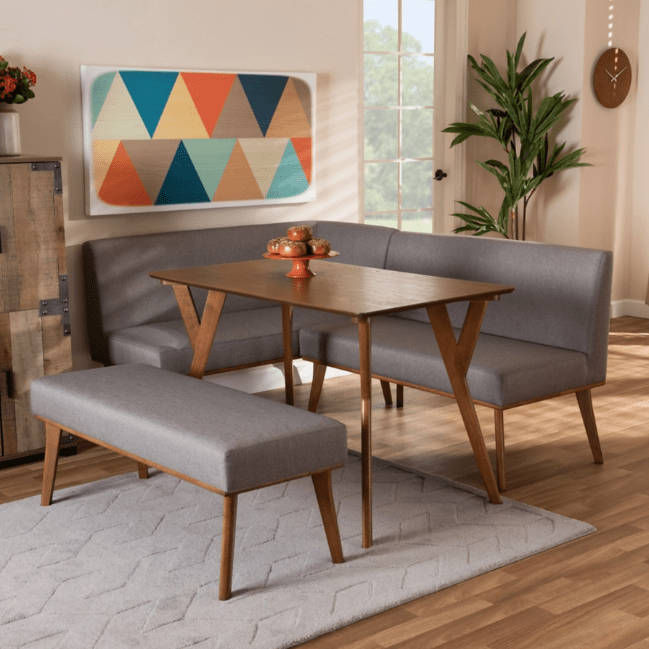 O ” Canto Alemão” ou “Banco de Canto” teve a sua origem onde o espaço era limitado, como em navios e bares. Após a Segunda Guerra Mundial, o mundo entrou em uma crise economica, forçando trabalhadores e donos de terras a vender o que ainda podia para sobreviver. Grandes famílias aristocratas, tanto na Europa quanto nos Estados Unidos, tiveram que desfazer de seus empregados e também de suas grandes casas vitorianas com sala de jantar. Construtores e arquitetos criativos improvisaram criando espaços íntimos em áreas pequenas, como uma mesa embutida e bancos combinando para a refeição matinal. Algumas plantas de casas eram tão pequenas que as salas de jantar e estar eram combinadas, ou a sala de jantar era completamente eliminada. A cozinha, que durante a era vitoriana era considerada o domínio dos empregados, estava evoluindo para um lugar mais agradável, mas mais compacto. Mesmo em casas que mantinham uma sala de jantar formal, a filosofia de vida casual permitia que as refeições em família fossem feitas na cozinha. Nessa época, a sala de jantar caiu em desuso e casas cada vez menor começaram a ser cada vez mais comum tornando-se necessário otimizar espaços, desse modo também nasceu os móveis embutidos.