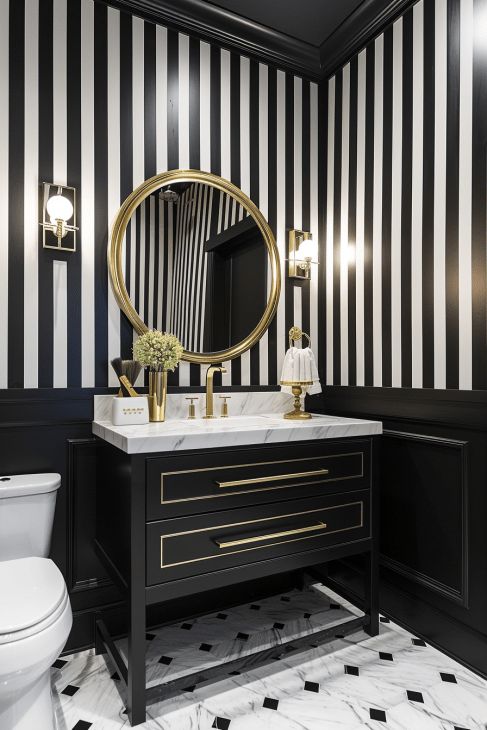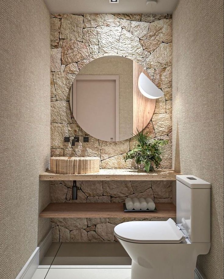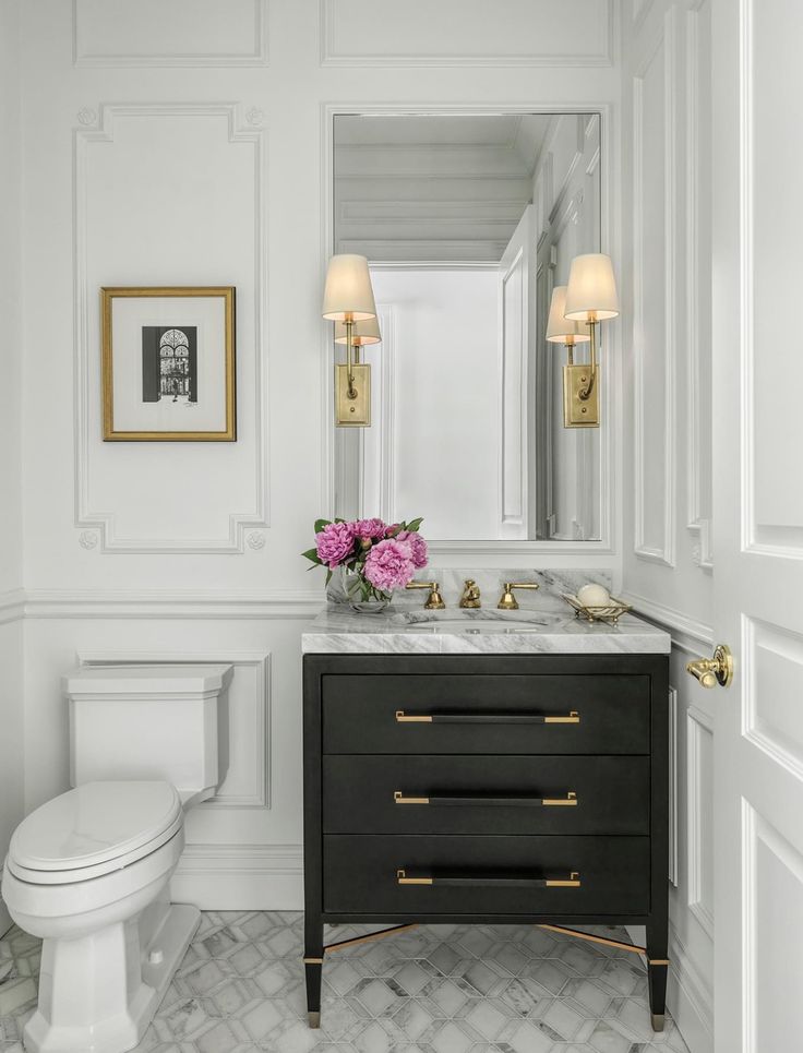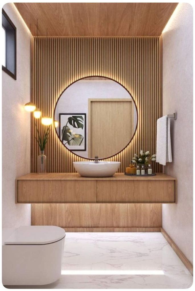 O lavado, por ser um espaço pequeno e de passagem, é um excelente espaço para abusar de detalhes decorativos. Papel de parede, cores fortes e/ou contrastantes, espelhos grandes, lampadários diferentes, pode ser uma ótima oportunidade para usá-los. Mesmo seguindo o estilo de decoração da casa, pode-se usar a criatividade. Por exemplo, se a casa segue um estilo mais minimalista, cores mais neutras, uso de materiais naturais como pedras, o lavabo pode seguir esse padrão e ser estiloso. Se o estilo for mais Clean, o uso de branco e madeiras claras sem muitos objetos decorativos, é uma boa opção. Se a casa segue um estilo mais classico, pode-se adaptar um móvel antigo como bancada para a pia, espelho com moldura trabalhada e dourada, papel de parede floral. Mas se você gosta de cores fortes, mas com um certo charme, pode se aventurar em paredes pretas ou verdes, papel de parede com fundo escuro. São tantas as opções que você pode se sentir perdido na hora de escolher, mas a dica está em seguir o estilo da casa pois serve como um guia. Veja alguns exemplos abaixo: